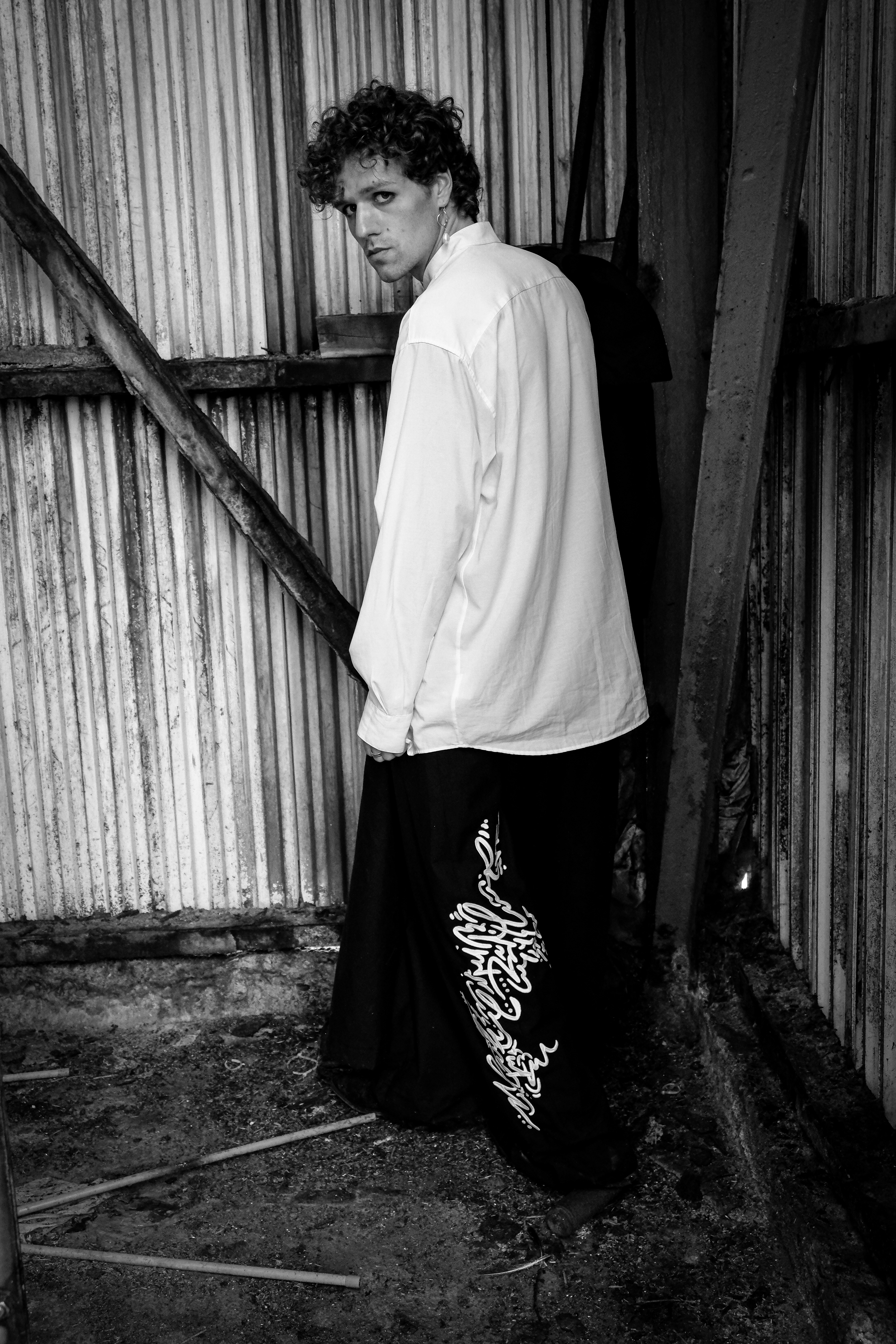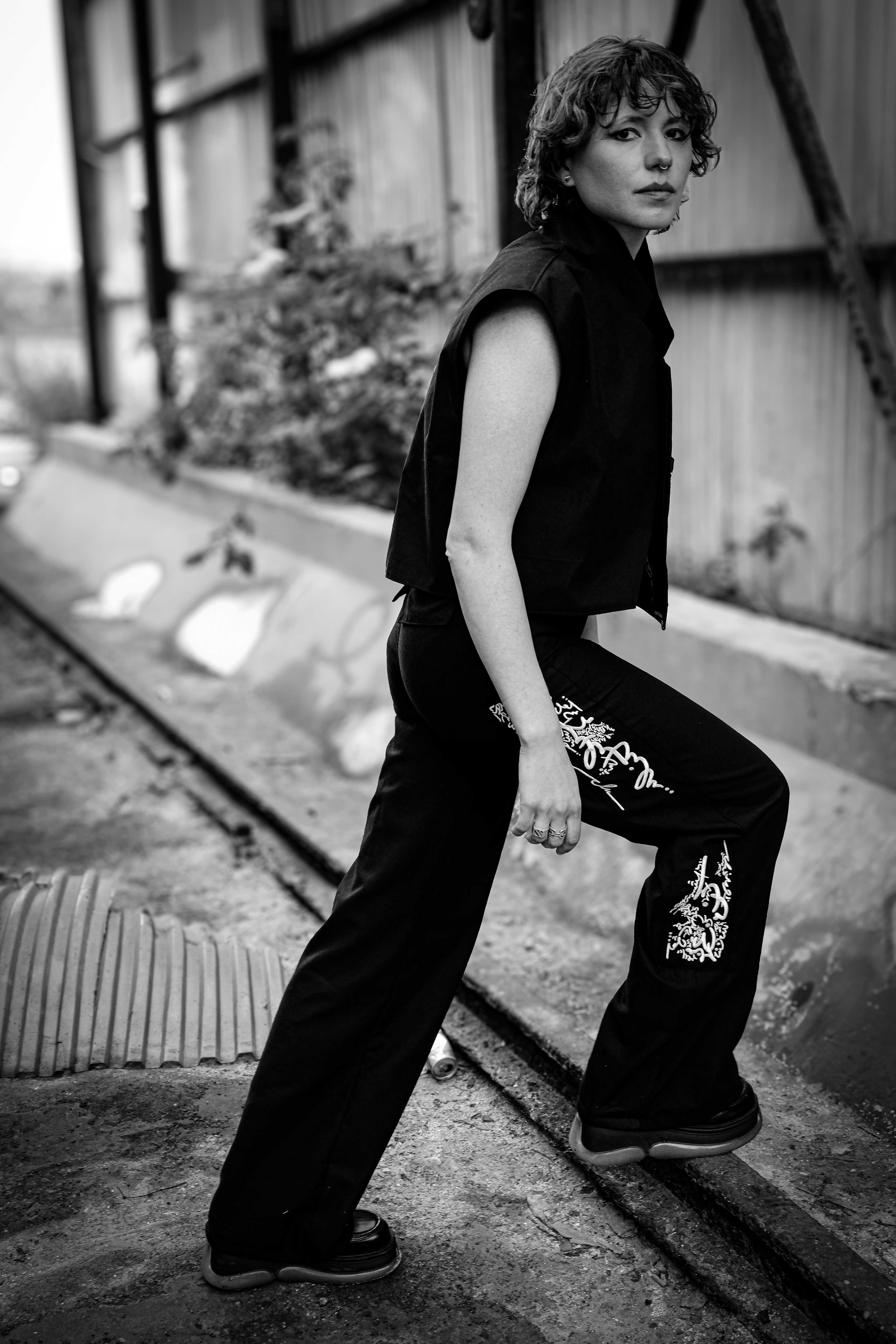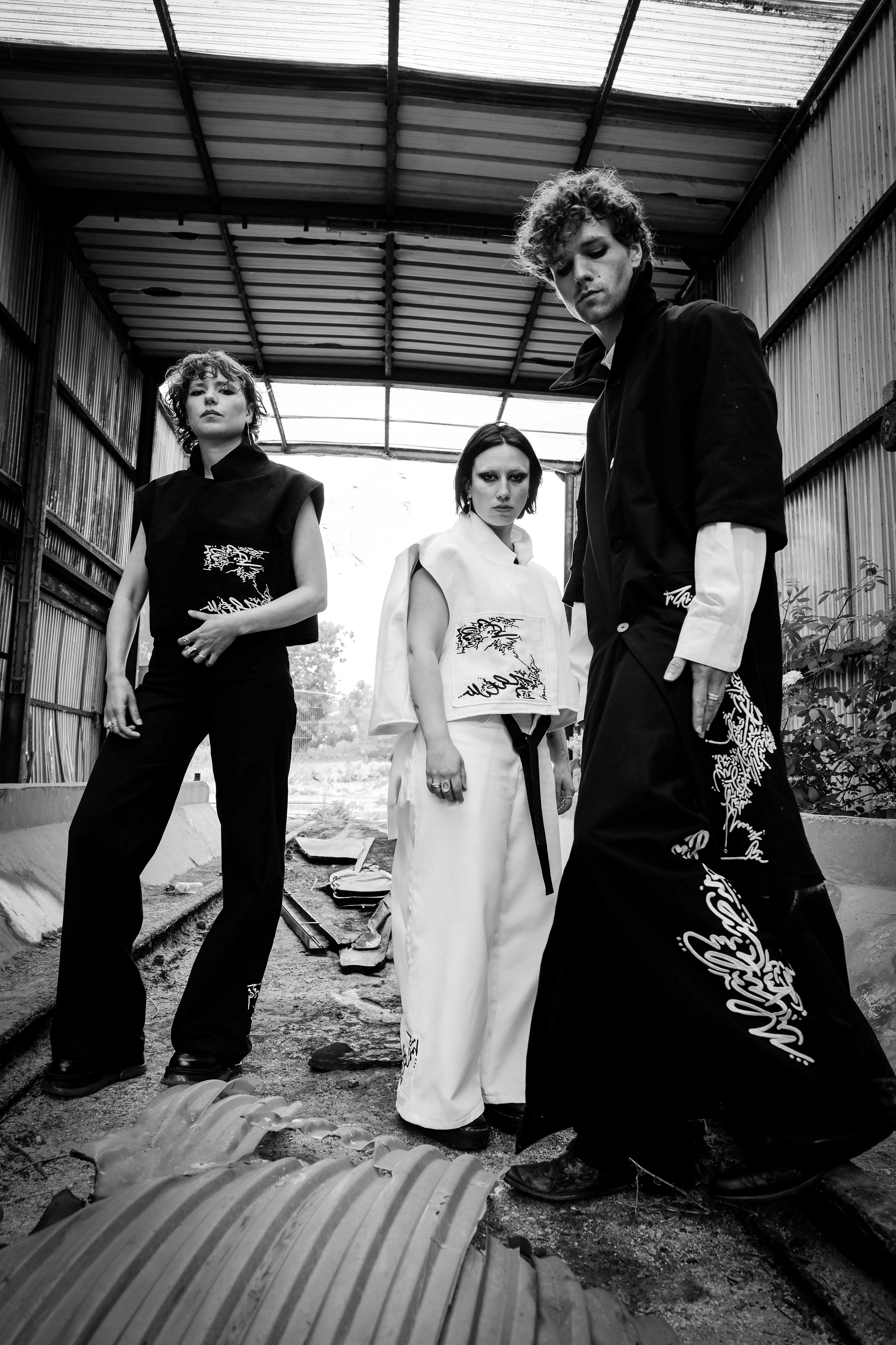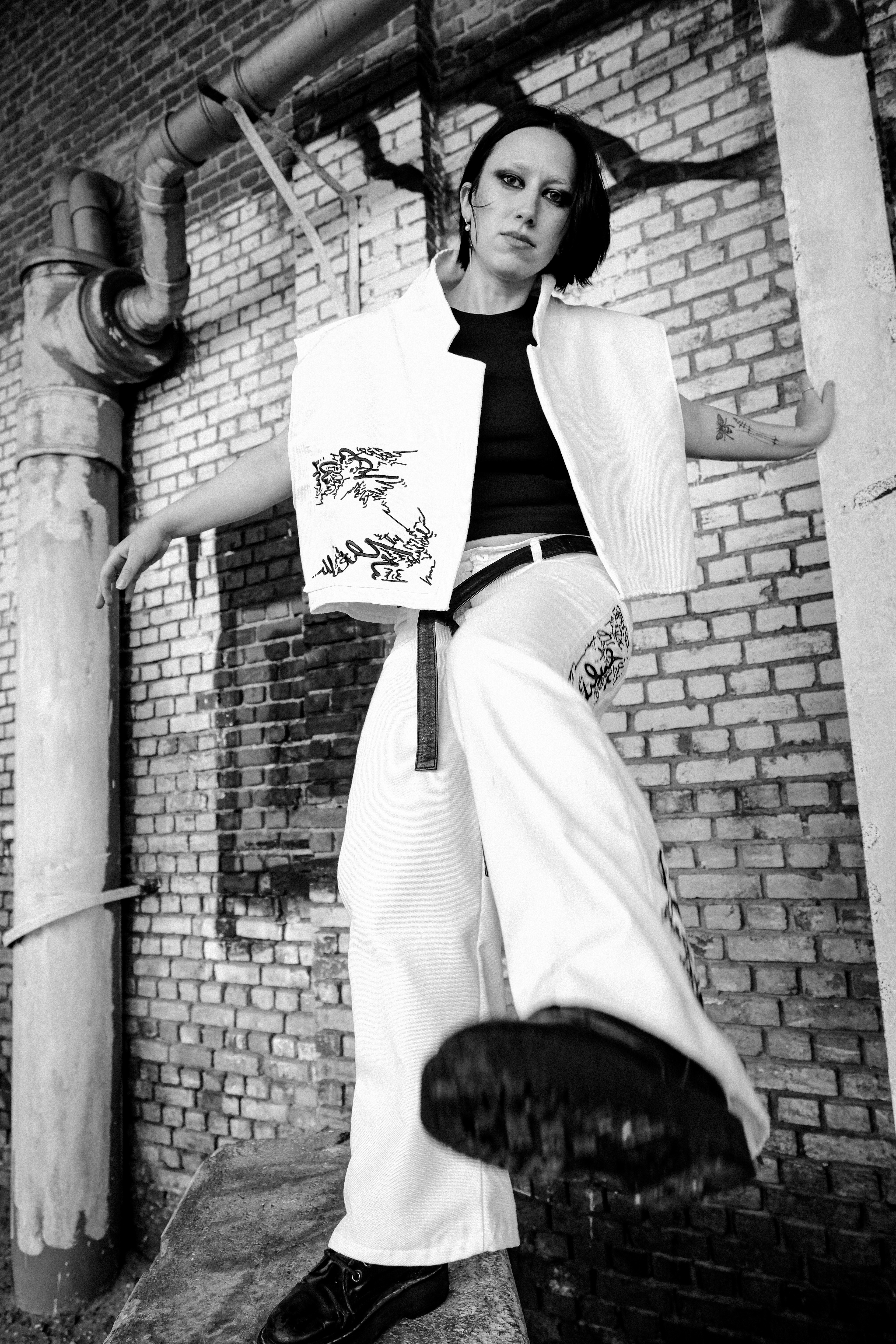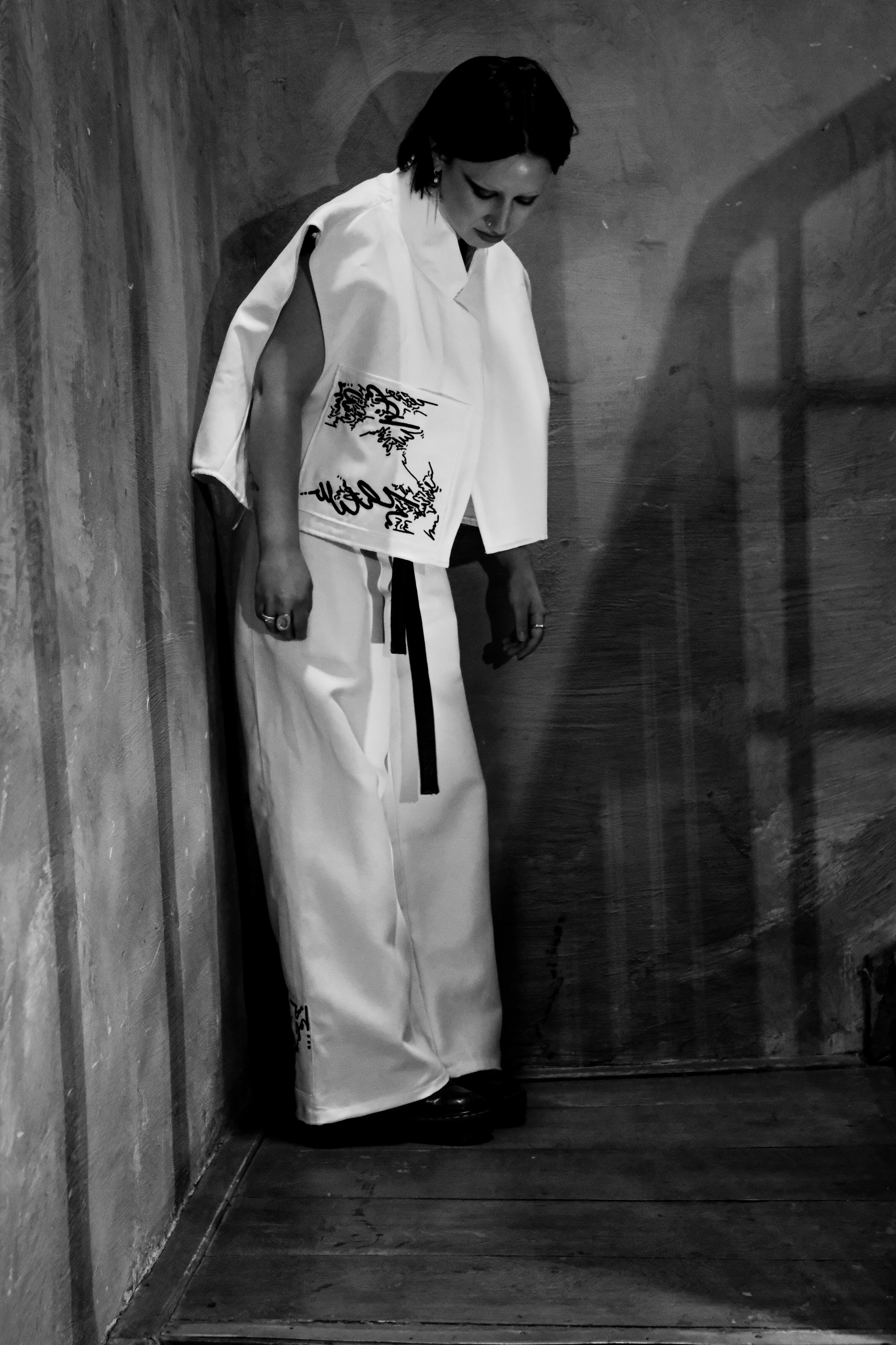 The garments are layered, forming an extra skin. Lines and fragments of text, drawn from my personal visual language, are embedded into the fabric, creating surfaces that feel both protective and exposed. Meaning is not fixed: it emerges through movement, touch and presence.